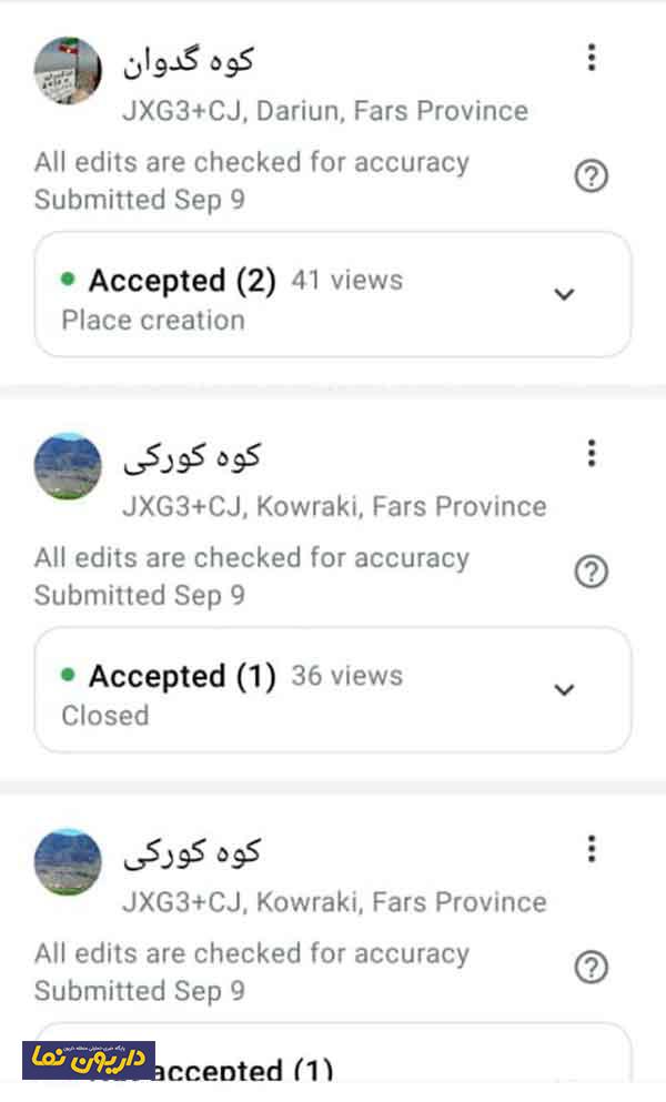 پس از انتشار گزارش داریون نما (اینجا) که هفدهم شهرویور ماه منتشر شد یکی از اهالی دلسوز منطقه داریون از کوشک مولا با تلاش خود توانست نقشه گوگل مپ را ویرایش و نام کوه گدوان دوباره در نقشه به ثبت برسد.