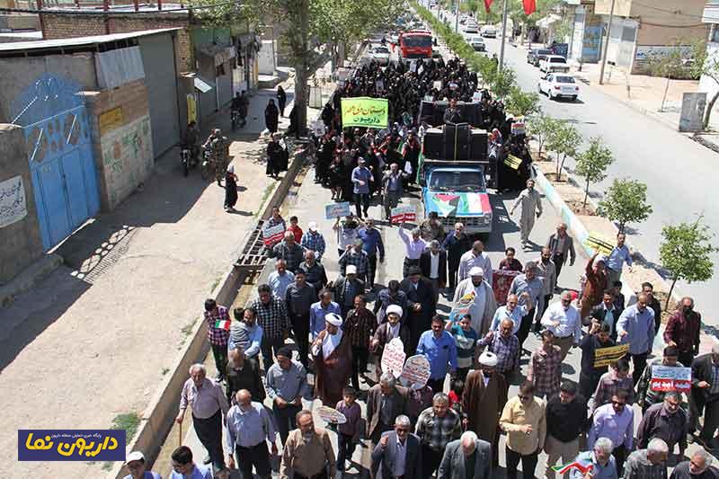 مراسم راهپیمایی روز جهانی قدس امروز – ۱۷ فروردین ماه – همزمان با آخرین جمعه ماه مبارک رمضان و همگام با سراسر کشور در منطقه داریون نیز برگزار شد و مردم با سردادن شعارهای ضد استکباری، یکصدا فریاد زدند: اسرائیل رفتنی است.