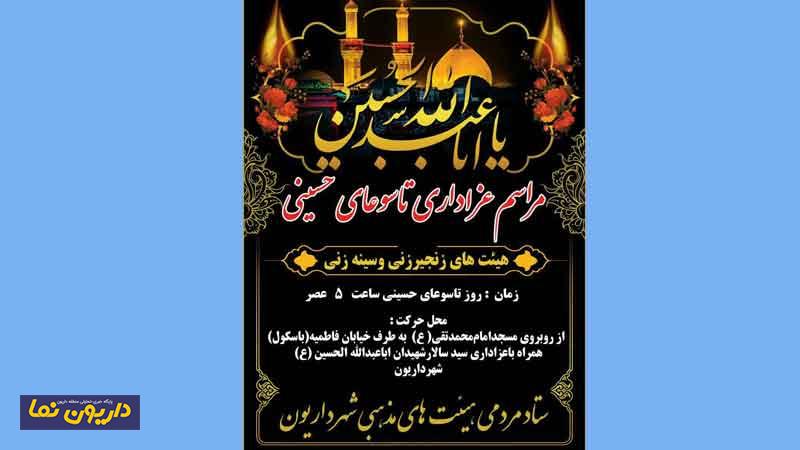 ستاد مردمی هیئت های مذهبی شهر داریون جزییات مراسم روز تاسوعای حسینی در داریون را اعلام کرد.