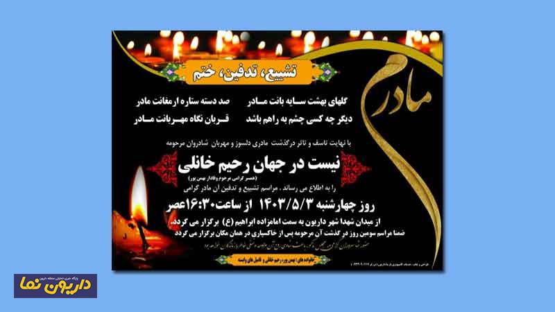 پایگاه خبری داریون نما آرزوی مغفرت و آمرزش برای آن مرحومه و صبر جزیل برای بستگان از درگاه خداوند متعال مسئلت دارد.